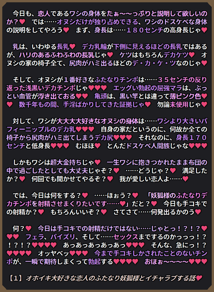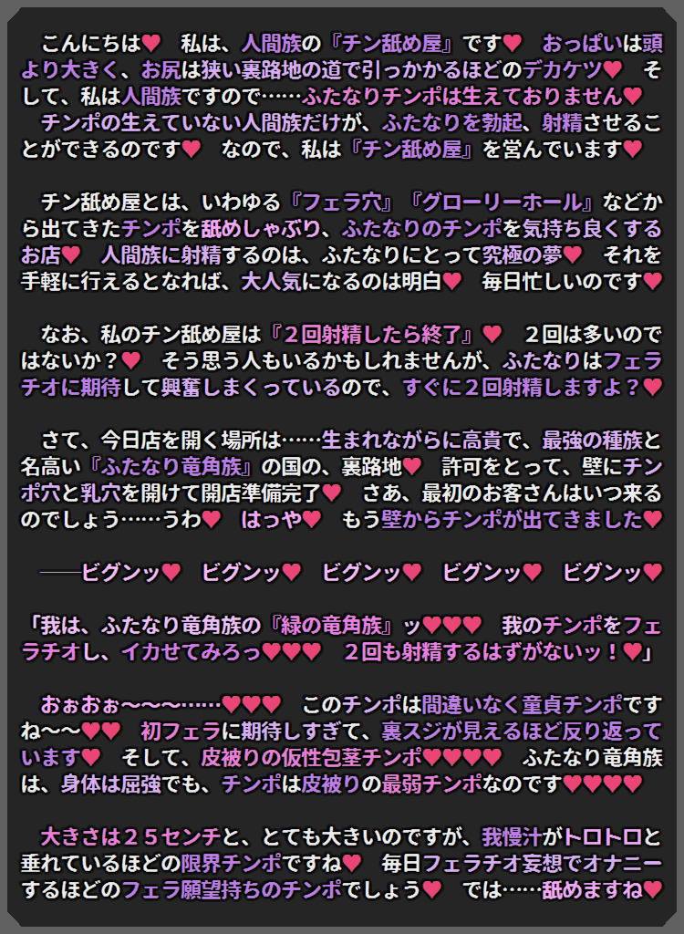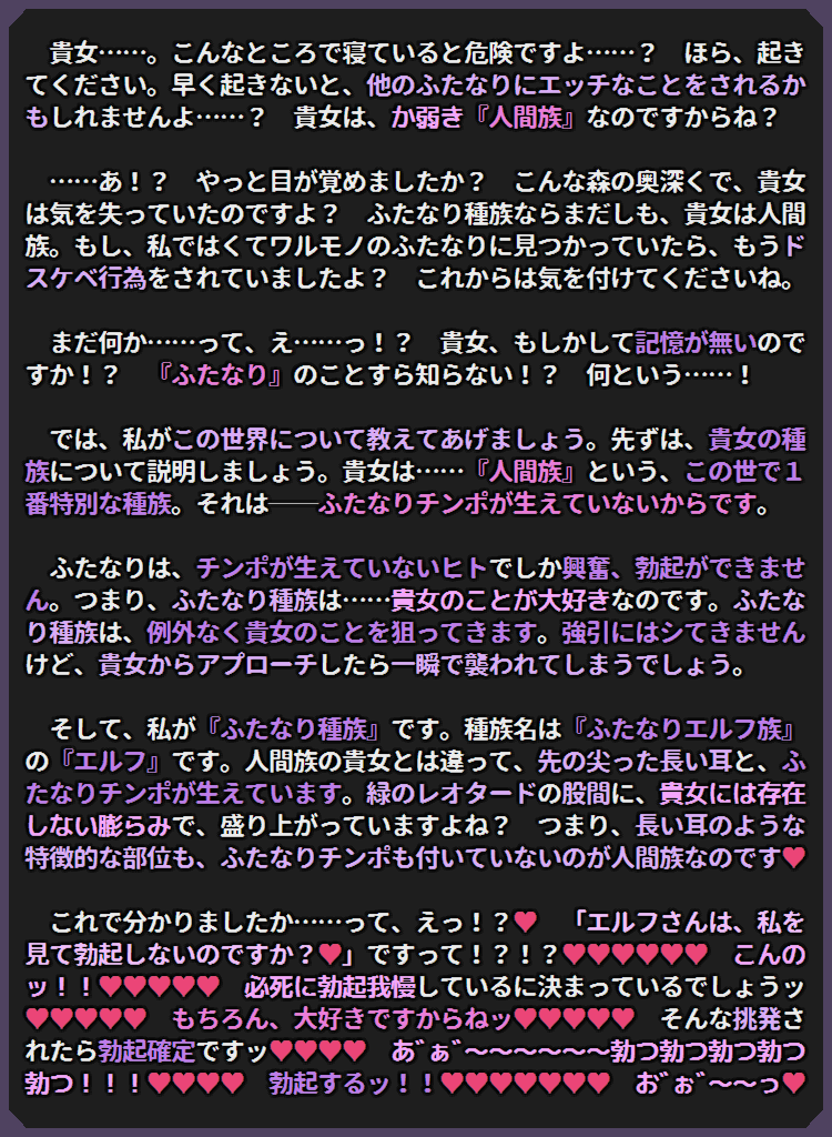 ふたなりは、チンポが生えていないヒトでしか興奮、勃起ができません。つまり、ふたなり種族は……貴女のことが大好きなのです。ふたなり種族は、例外なく貴女のことを狙ってきます。強引にはシてきませんけど、貴女からアプローチしたら一瞬で襲われてしまうでしょう。