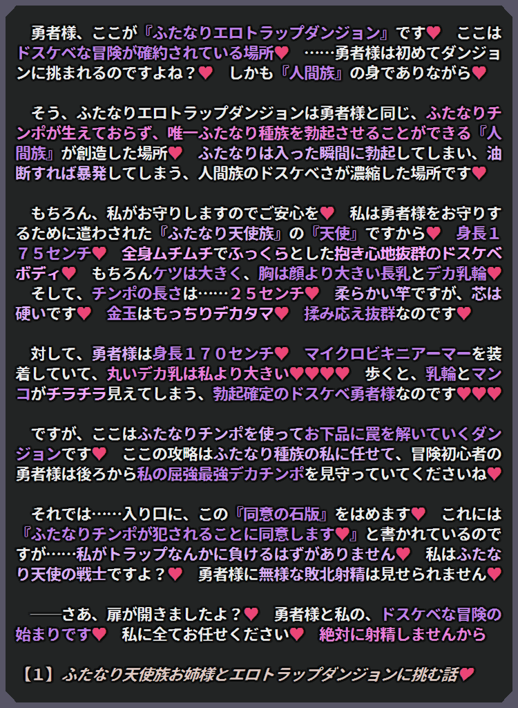 では、私がこの世界について教えてあげましょう。先ずは、貴女の種族について説明しましょう。貴女は……『人間族』という、この世で1番特別な種族。それは──ふたなりチンポが生えていないからです。