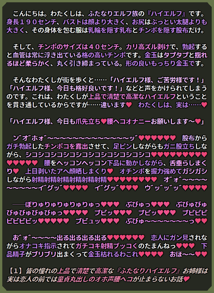 お゙ほぉ゙ぉ゙ぉ゙~~~~~~~……♥♥♥♥♥♥ ふたなりエルフ族の、ぴっちり♥ドスケベ♥ハイレグレオタード♥の中で、バッキバキに勃起♥♥♥♥ レオタードが破れそうなほどチンポが浮き出て、ビクンビクン揺れまくり♥♥♥♥ オラッ♥♥♥♥ 私の40センチの極デカチンポを見て驚きなさいっ♥♥♥♥♥ これがエルフのチンポですッ♥